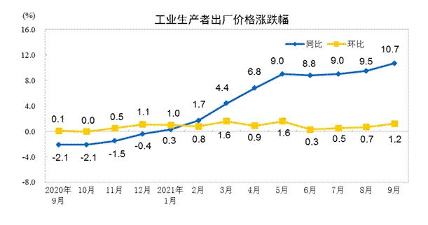 與CPI的溫和上漲不同,受煤炭和部分高耗能行業(yè)產(chǎn)品價(jià)格上漲等因素影響,9月PPI漲幅創(chuàng)下了10.7%的新高。