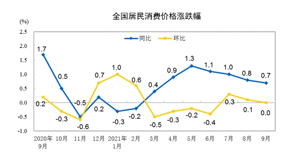 國家統(tǒng)計(jì)局14日發(fā)布數(shù)據(jù),9月份,全國居民消費(fèi)價(jià)格指數(shù)(CPI)同比上漲0.7%,漲幅比上月回落0.1個(gè)百分點(diǎn);工業(yè)生產(chǎn)者出廠價(jià)格指數(shù)(PPI)同比上漲10.7%,漲幅比上月擴(kuò)大1.2個(gè)百分點(diǎn)。
