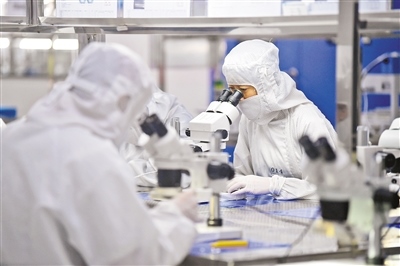 工人在包頭江馨微電機(jī)科技有限公司數(shù)字化百級(jí)無(wú)塵車(chē)間趕制配套5G手機(jī)產(chǎn)品的音圈馬達(dá)。