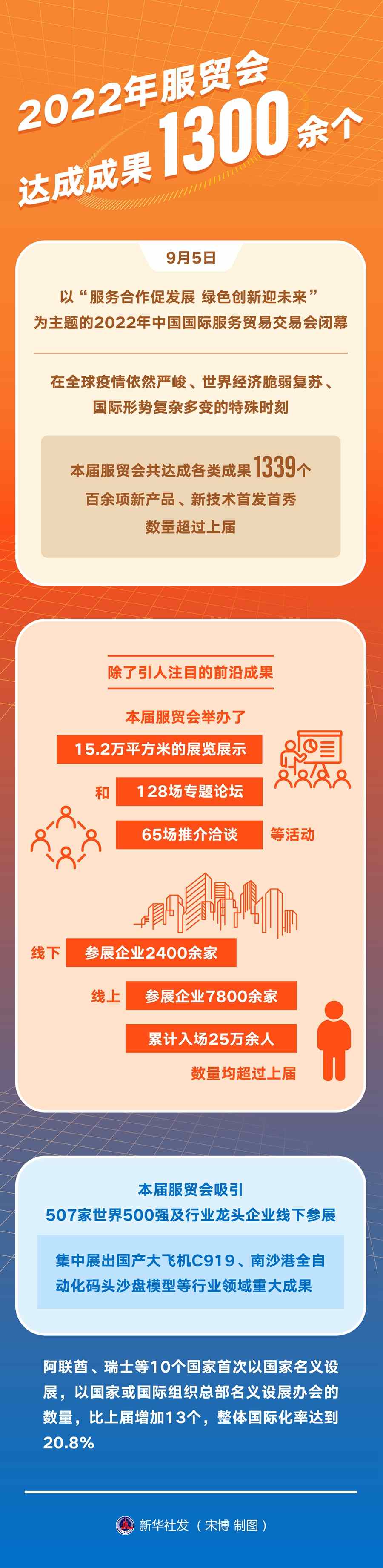 9月5日,以“服務(wù)合作促發(fā)展綠色創(chuàng)新迎未來”為主題的2022年中國國際服務(wù)貿(mào)易交易會(huì)閉幕。在全球疫情依然嚴(yán)峻、世界經(jīng)濟(jì)脆弱復(fù)蘇、國際形勢(shì)復(fù)雜多變的特殊時(shí)刻,本屆服貿(mào)會(huì)共達(dá)成各類成果1339個(gè),百余項(xiàng)新產(chǎn)品、新技術(shù)首發(fā)首秀,數(shù)量超過上屆。
