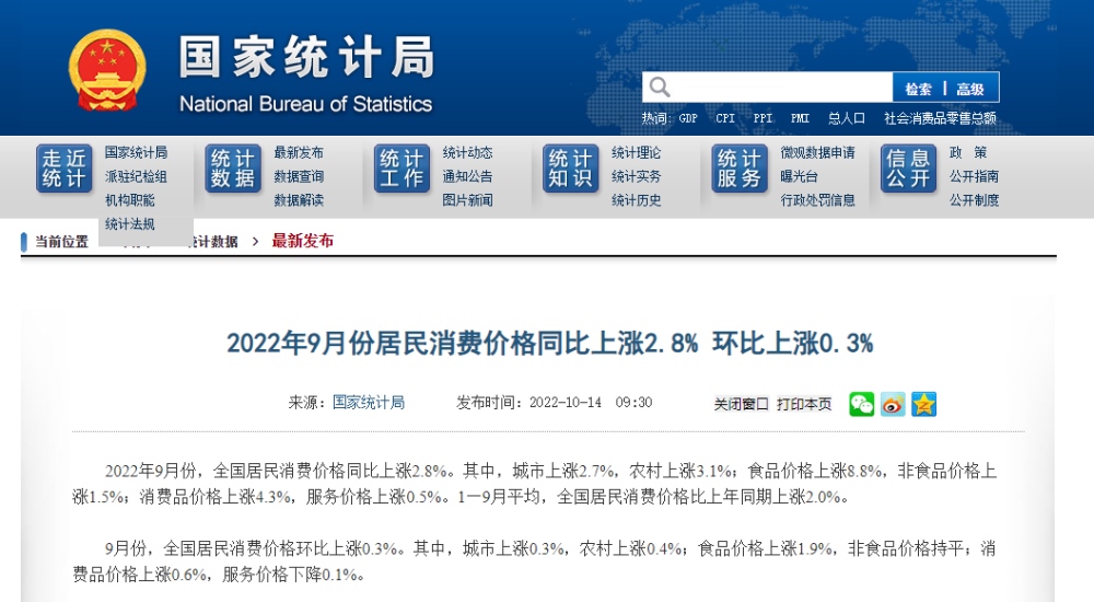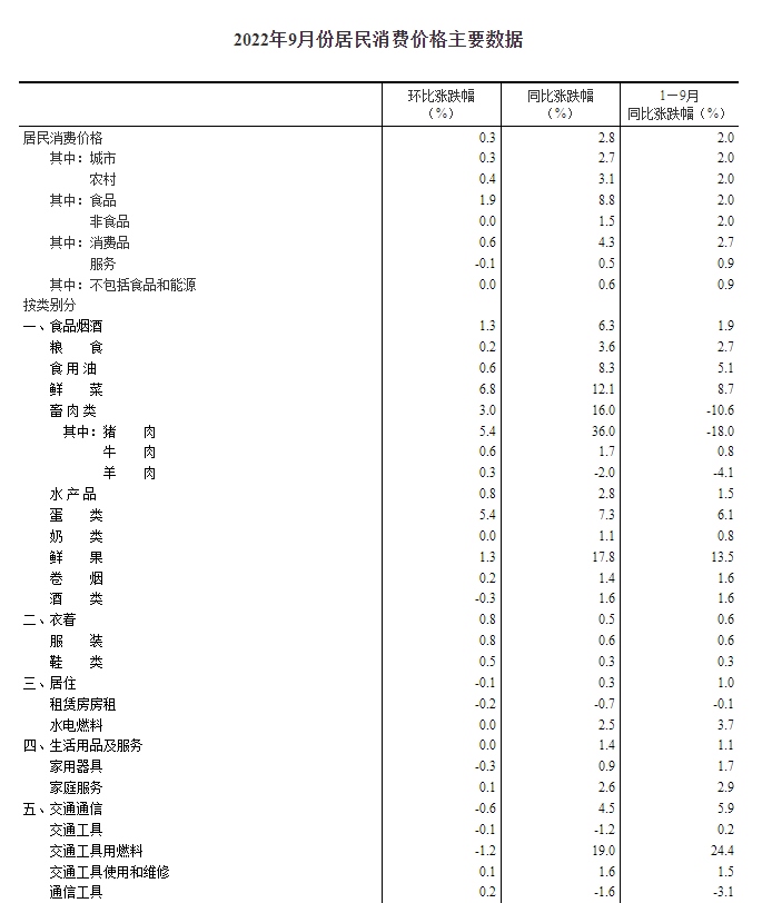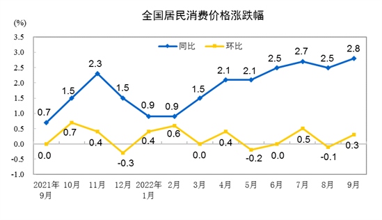 國家統(tǒng)計局:9月份居民消費(fèi)價格同比上漲2.8%