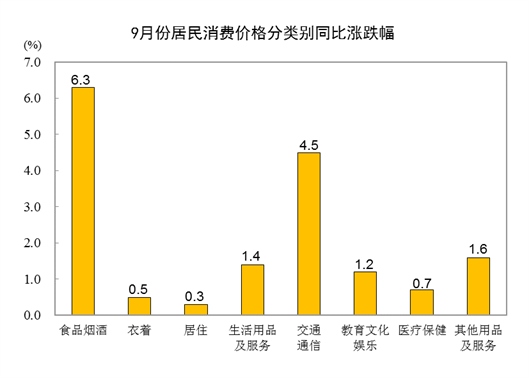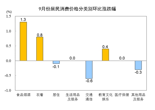 9月份,全國居民消費(fèi)價格環(huán)比上漲0.3%。其中,城市上漲0.3%,農(nóng)村上漲0.4%;食品價格上漲1.9%,非食品價格持平;消費(fèi)品價格上漲0.6%,服務(wù)價格下降0.1%。