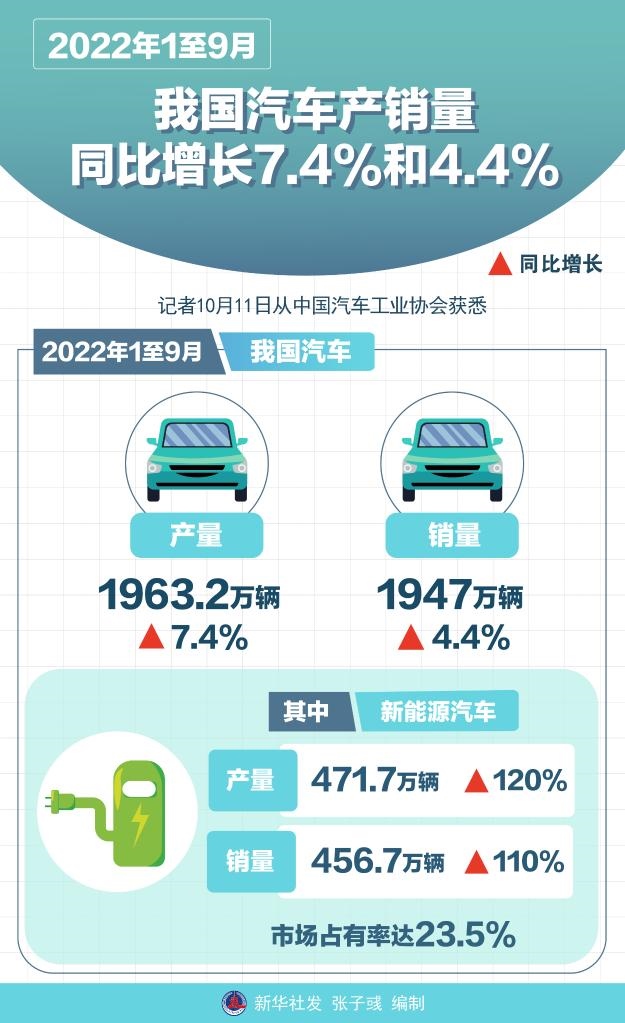 記者11日從中國汽車工業(yè)協(xié)會(huì)獲悉,今年1至9月,我國汽車產(chǎn)銷量分別達(dá)1963.2萬輛和1947萬輛,同比增長(zhǎng)7.4%和4.4%。其中,新能源汽車產(chǎn)銷量分別達(dá)471.7萬輛和456.7萬輛,同比增長(zhǎng)120%和110%,市場(chǎng)占有率達(dá)23.5%。