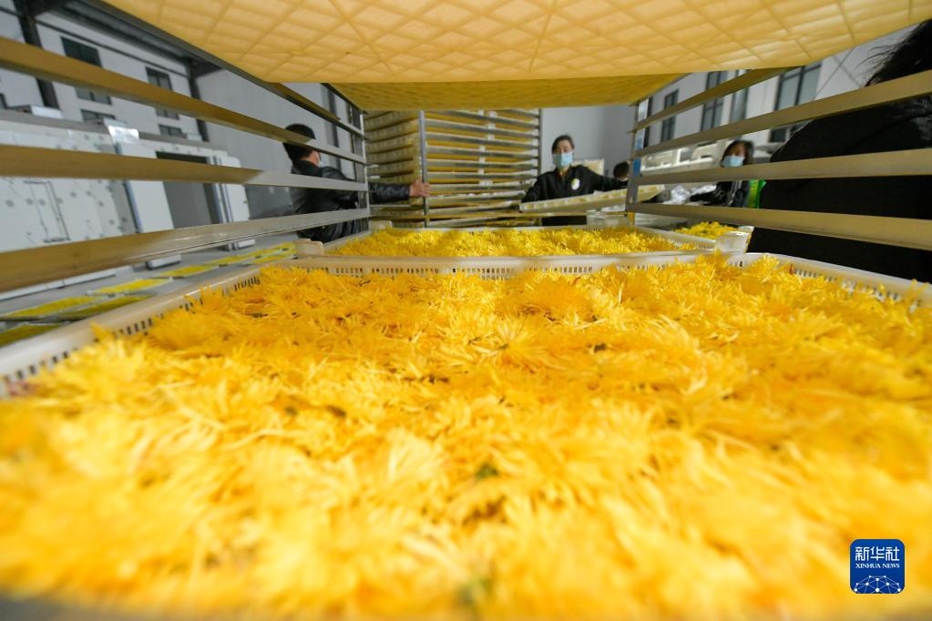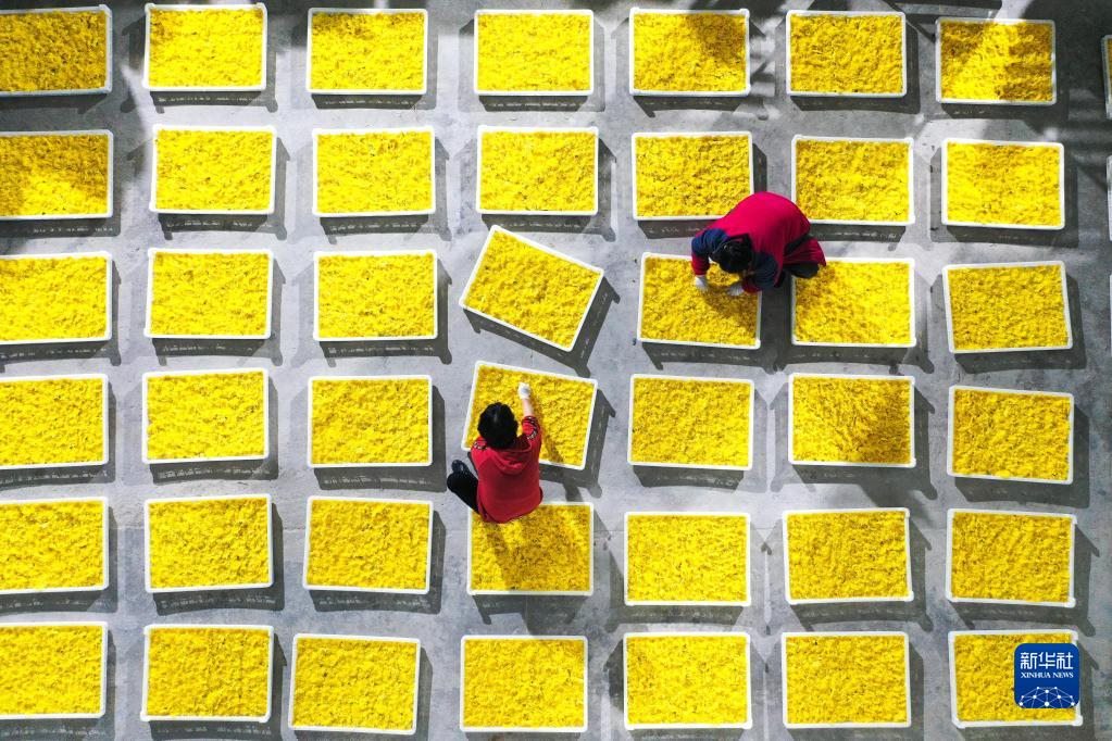 金秋時(shí)節(jié),貴州省黔南布依族苗族自治州貴定縣云霧鎮(zhèn)種植的1000余畝菊花陸續(xù)進(jìn)入采摘期,當(dāng)?shù)卮迕衩χ烧?、分揀、烘干菊花,供?yīng)市場(chǎng)。