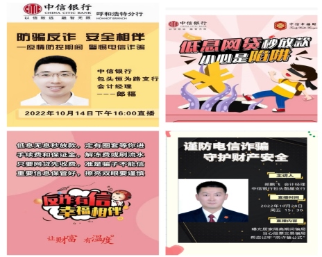 疫情期間,中信銀行呼和浩特分行各經(jīng)營機(jī)構(gòu)積極開展線上反詐宣傳,通過朋友圈、公眾號及線上直播活動積極開展金融反詐宣傳,切實(shí)提升金融客戶識別詐騙手段的能力和防范金融風(fēng)險的意識。