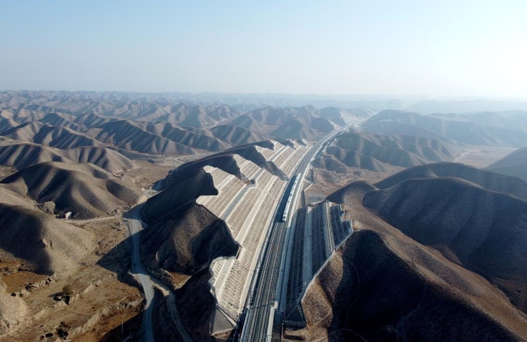 試驗(yàn)列車在銀蘭高鐵甘肅段內(nèi)運(yùn)行。新華社發(fā) 袁暉 攝