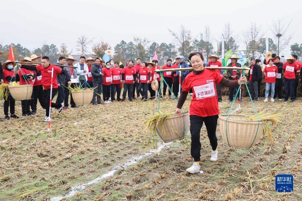11月15日,在德清縣舉辦的美好家園運(yùn)動會暨新安鎮(zhèn)稻田爭霸賽上,村民參加挑稻谷接力賽。新華社發(fā)(姚海翔 攝)
