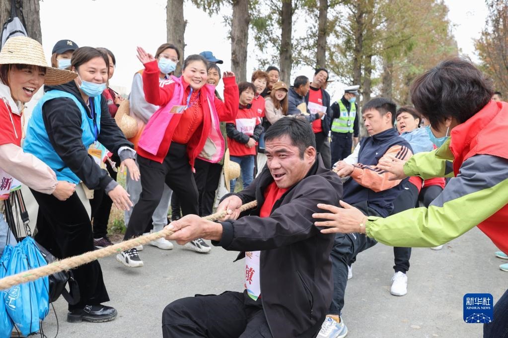 11月15日,在德清縣舉辦的美好家園運(yùn)動會暨新安鎮(zhèn)稻田爭霸賽上,村民參加拔河比賽。新華社發(fā)(姚海翔 攝)
