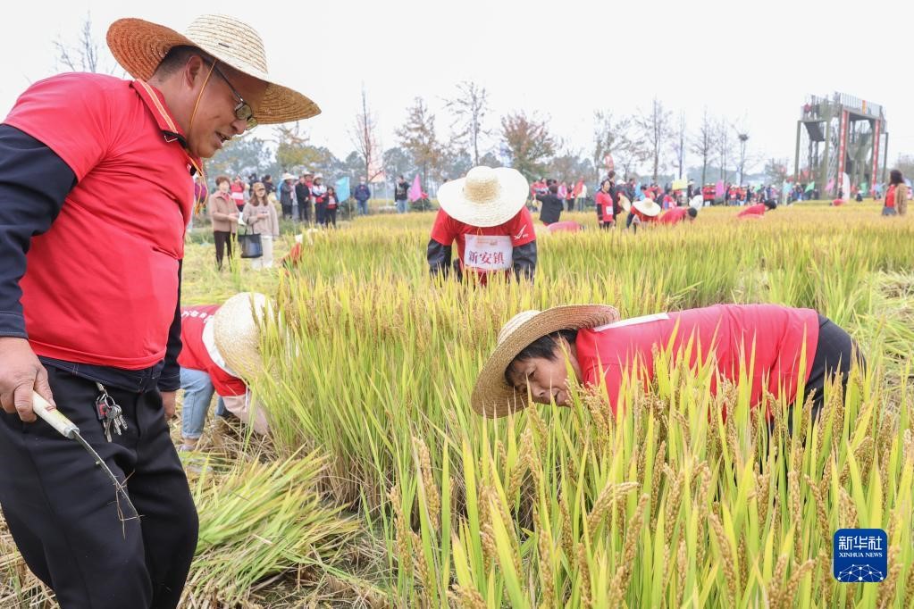 11月15日,在德清縣舉辦的美好家園運(yùn)動會暨新安鎮(zhèn)稻田爭霸賽上,村民參加割稻比賽。新華社發(fā)(姚海翔 攝)