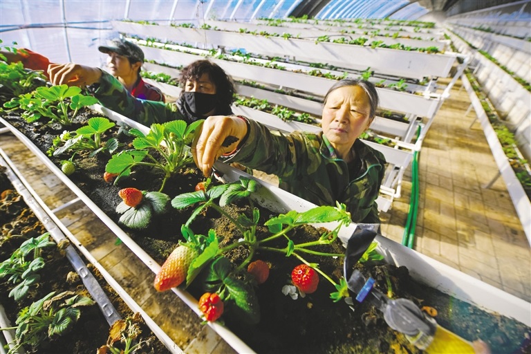 春節(jié)期間,蘇尼特右旗賽漢塔拉鎮(zhèn)扶貧產(chǎn)業(yè)園區(qū)的日光大棚里,菜農(nóng)們正在采摘立體種植的草莓。當(dāng)?shù)攸h委政府引導(dǎo)居民整合土地建設(shè)日光溫室大棚,以“土地入股企業(yè)分紅”“承包大棚按企業(yè)要求種植”“務(wù)工就業(yè)”等方式實現(xiàn)增收致富。(記者 王曉博 攝)