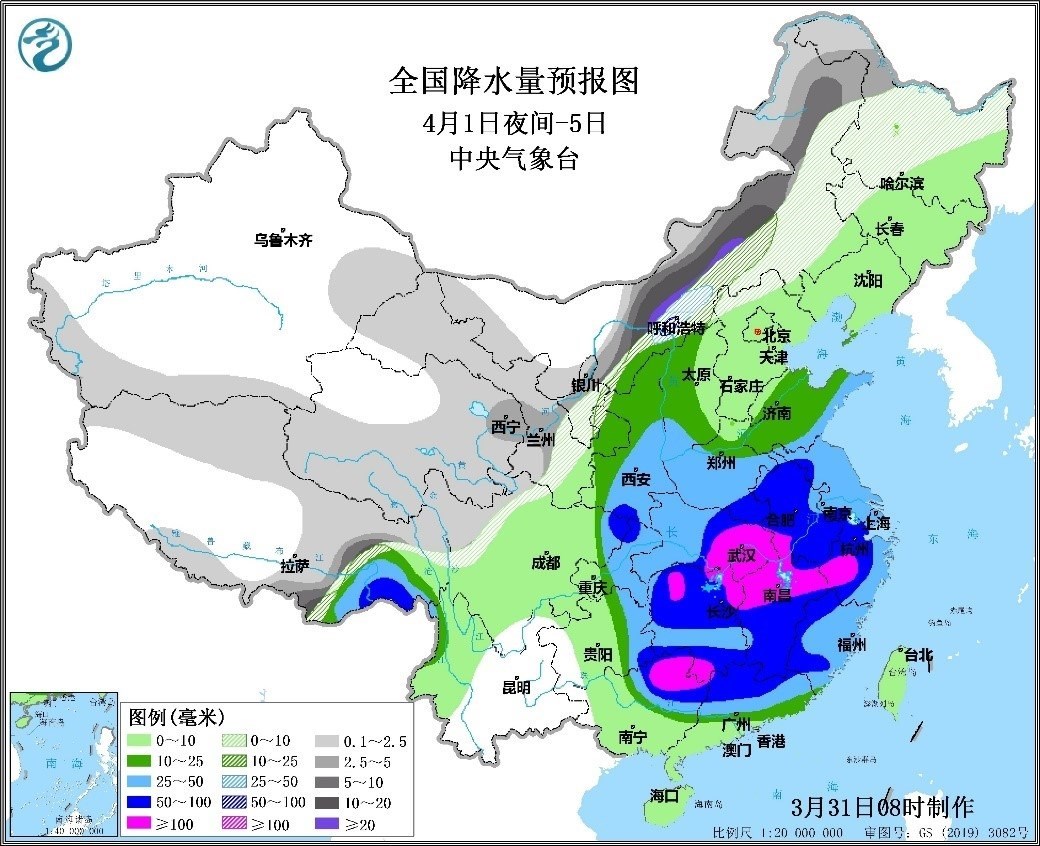 4月1日夜間至5日,甘肅東部、寧夏、河北北部和內(nèi)蒙古中東部等地有中到大雪或雨夾雪,內(nèi)蒙古中部等地局地暴雪或大暴雪,主要降雪時(shí)段為2日至3日;西北地區(qū)東南部、西南地區(qū)東部、江漢、江淮、江南、華南以及黃淮等地有中到大雨,其中河南東南部、湖北東部、湖南、安徽、江西、浙江西部、廣西北部、廣東北部和福建西部等地的部分地區(qū)有暴雨,局地大暴雨;主要降水時(shí)段為2日至4日。上述地區(qū)累計(jì)降水量20-50毫米,部分地區(qū)有70-120毫米,局地可達(dá)160毫米;100毫米以上降雨覆蓋面積達(dá)23萬(wàn)平方公里。江淮及以南地區(qū)伴有短時(shí)強(qiáng)降水、雷暴大風(fēng)或冰雹等強(qiáng)對(duì)流天氣,最大小時(shí)降水量30-60毫米;江南北部、江漢東部、江淮等地伴有10級(jí)以上雷暴大風(fēng)。