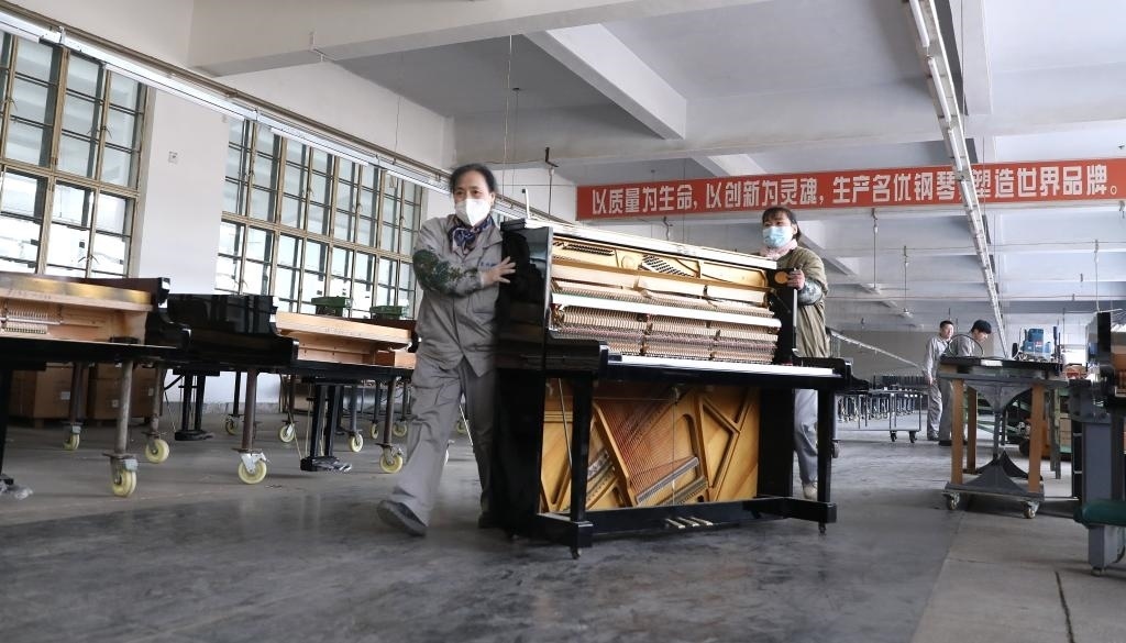 2月21日,工人在東北鋼琴樂器有限公司車間內(nèi)推運(yùn)鋼琴組件,趕制外貿(mào)訂單。新華社記者 姚劍鋒 攝