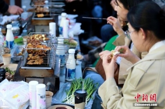 山東淄博,食客正在享用燒烤。 中新社記者 梁犇 攝
