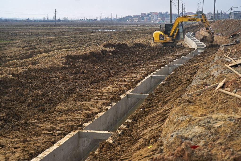 2月21日,施工人員在江西省南昌市新建區(qū)象山鎮(zhèn)高標(biāo)田建設(shè)現(xiàn)場加固灌溉渠。新華社記者 萬象 攝
