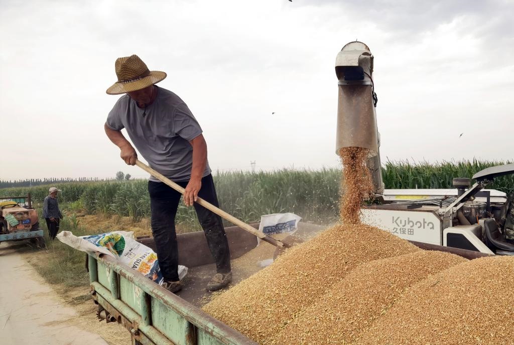 ??臨河區(qū)烏蘭圖克鎮(zhèn)隆勝村村民正在收獲小麥。新華社記者李云平 攝