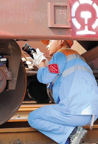 在鄭州北站,一名工人正對車底進行檢修。本報記者 何嘉豪攝