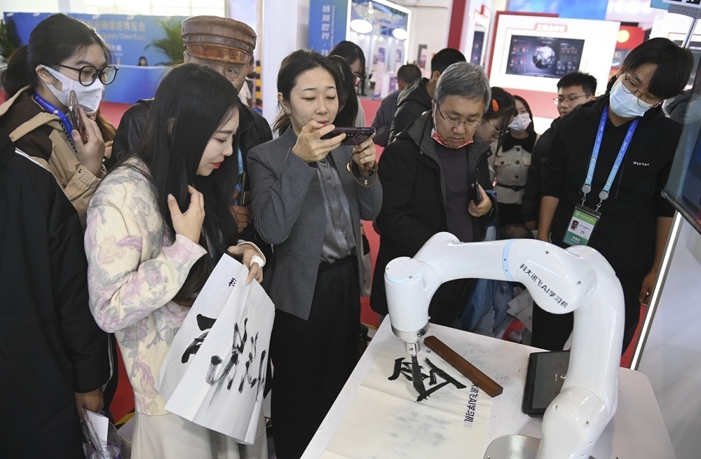 參觀者在首屆中國國際供應鏈促進博覽會數字科技鏈展區(qū)科大訊飛展位觀看一款AI書法機器人寫毛筆字(2023年12月2日攝)。新華社記者 蔡湘鑫 攝