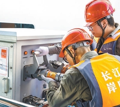 國網宜昌供電公司岸電運維人員為靠泊船舶接通岸電。鄭家裕攝