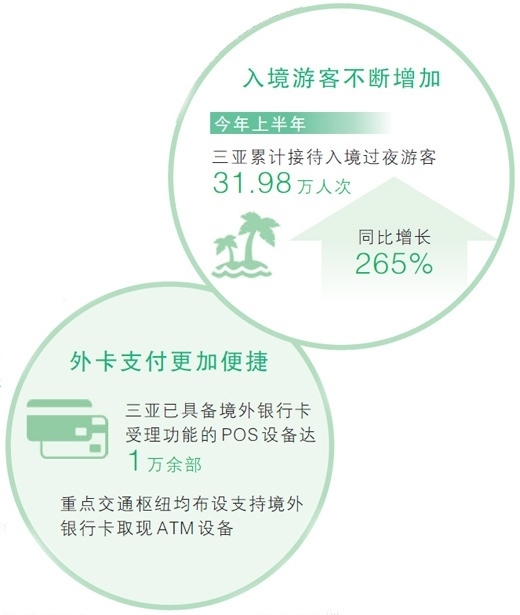 截至目前,三亞已具備境外銀行卡受理功能的POS設(shè)備達(dá)1萬余部,全市支持境外銀行卡取現(xiàn)的ATM設(shè)備499臺(tái),貨幣代兌點(diǎn)59個(gè),現(xiàn)金“零錢包”發(fā)放超6.6萬個(gè)。其中,機(jī)場(chǎng)、動(dòng)車站、郵輪碼頭等重點(diǎn)交通樞紐均布設(shè)支持境外銀行卡取現(xiàn)ATM設(shè)備,機(jī)場(chǎng)航站樓內(nèi)支持境外銀行卡支付商戶覆蓋率達(dá)99%,大東海旅游區(qū)周邊商戶POS設(shè)備80%以上支持境外銀行卡支付……
