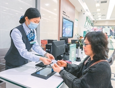 “社保服務(wù)事項(xiàng)進(jìn)銀行”是重慶市社會(huì)保險(xiǎn)局創(chuàng)新推出的一項(xiàng)公益服務(wù),合作銀行通過(guò)所有人工服務(wù)網(wǎng)點(diǎn)、智能自助服務(wù)終端以及手機(jī)銀行App,向群眾免費(fèi)提供社保服務(wù)。圖為中國(guó)農(nóng)業(yè)銀行重慶沙坪壩天星橋支行,工作人員為市民辦理相關(guān)社保業(yè)務(wù)。孫凱芳攝(人民視覺(jué))