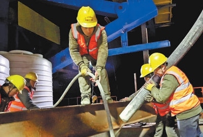 寒風勁吹,杭州灣跨海鐵路大橋建設現(xiàn)場依舊熱火朝天,千余名建設者正在緊張地進行大橋橋墩墩身施工作業(yè)。