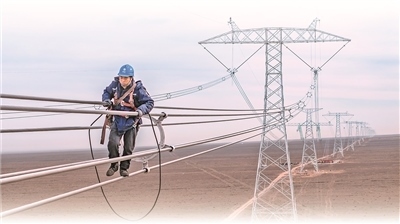 新疆伊吾縣淖毛湖鎮(zhèn),工人在進行高空作業(yè)。
