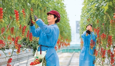 近年來,江蘇省南通市通州區(qū)大力推動智慧設施農(nóng)業(yè)、生態(tài)高效農(nóng)業(yè)園區(qū)發(fā)展,促進農(nóng)業(yè)生產(chǎn)提質(zhì)增效。圖為通州區(qū)十總鎮(zhèn)圓宏萬嘉智慧農(nóng)業(yè)基地的智能大棚內(nèi),工人在采摘成熟的小番茄。