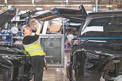 在位于湖北武漢經(jīng)開(kāi)區(qū)的嵐圖汽車數(shù)字化總裝車間,工人在流水線上作業(yè)。
