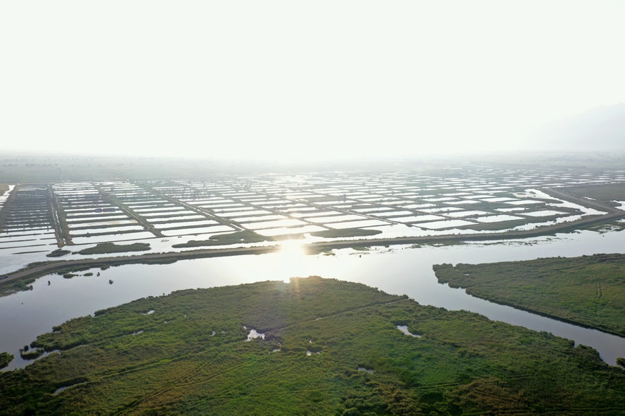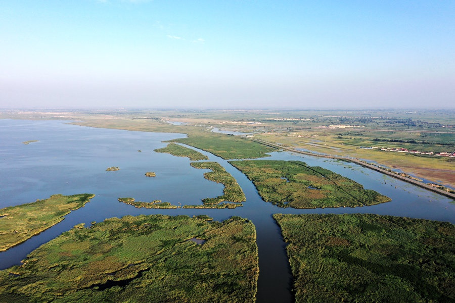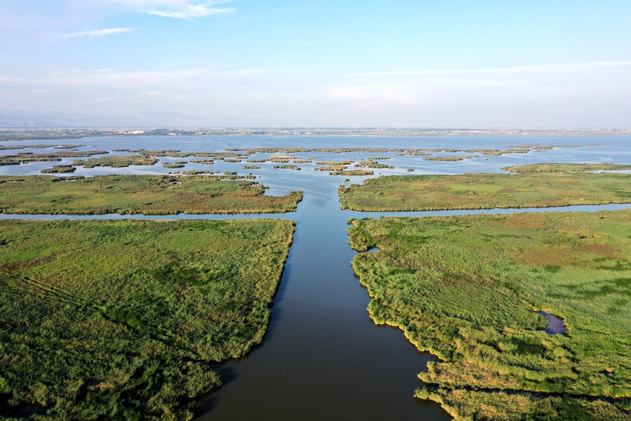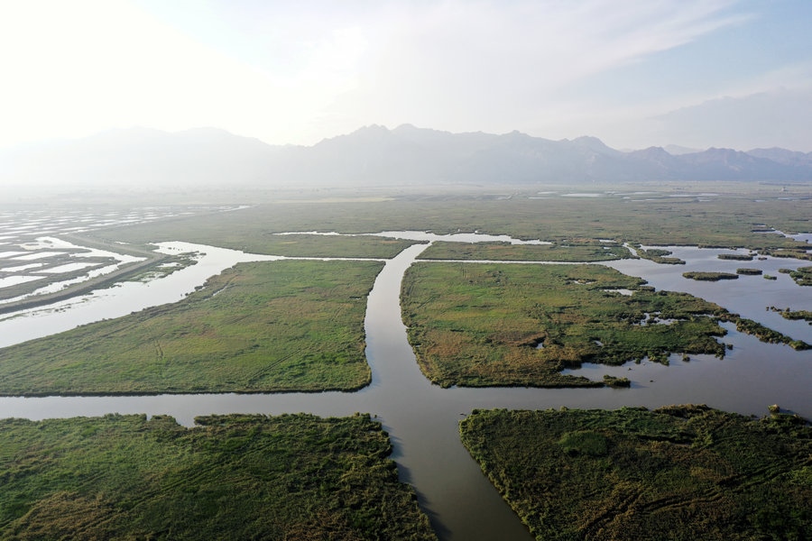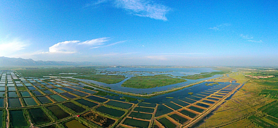 夏日的哈素海濕地,湖水清波蕩漾,水鳥嬉戲成群,山湖相映,一派生機。