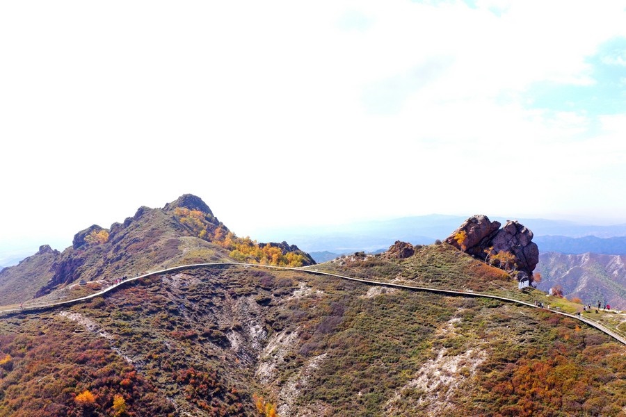 9月26日,游客在一片金黃的固陽馬鞍山游玩