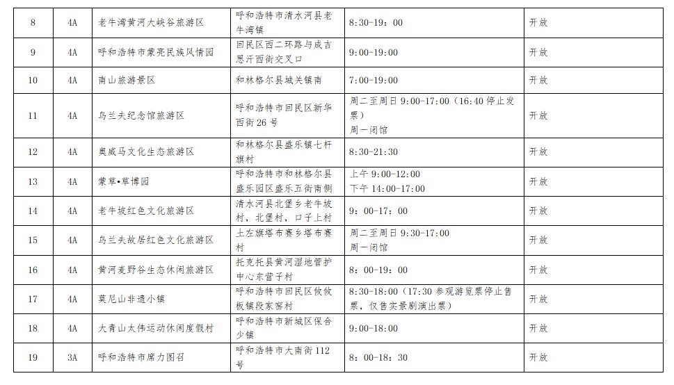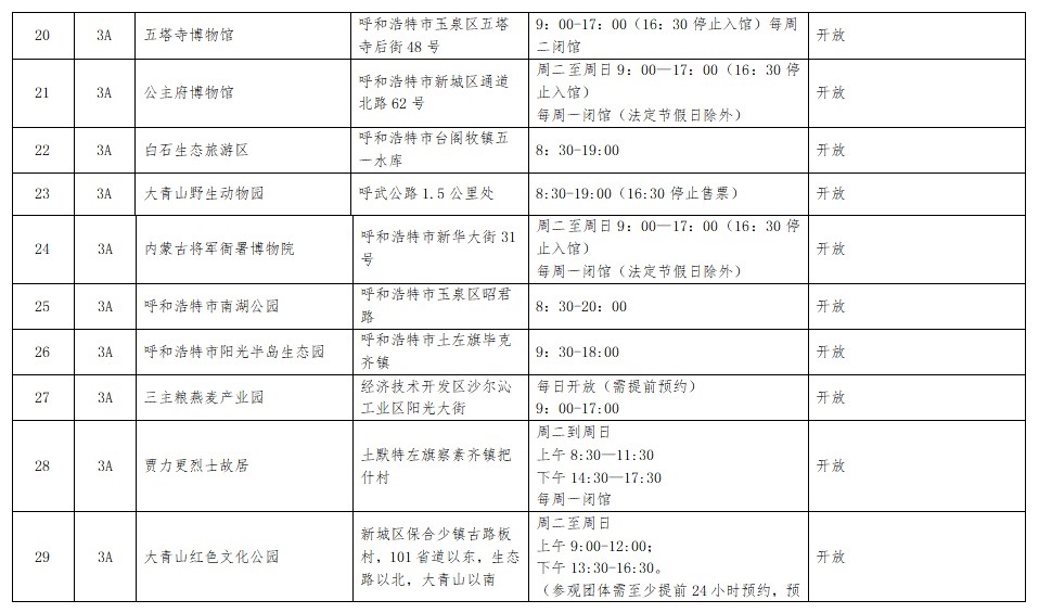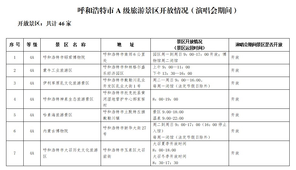 呼和浩特市(演唱會(huì)期間)A級(jí)旅游景區(qū)開放情況早知道