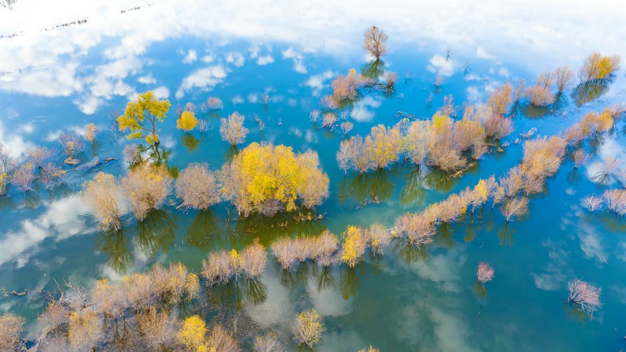 秋冬交替之際,位于呼和浩特土默特左旗的哈素海,水天一色,樹影倒映,構(gòu)成一幅美麗的水彩畫卷,猶如人間仙境。 樂炎 攝影
