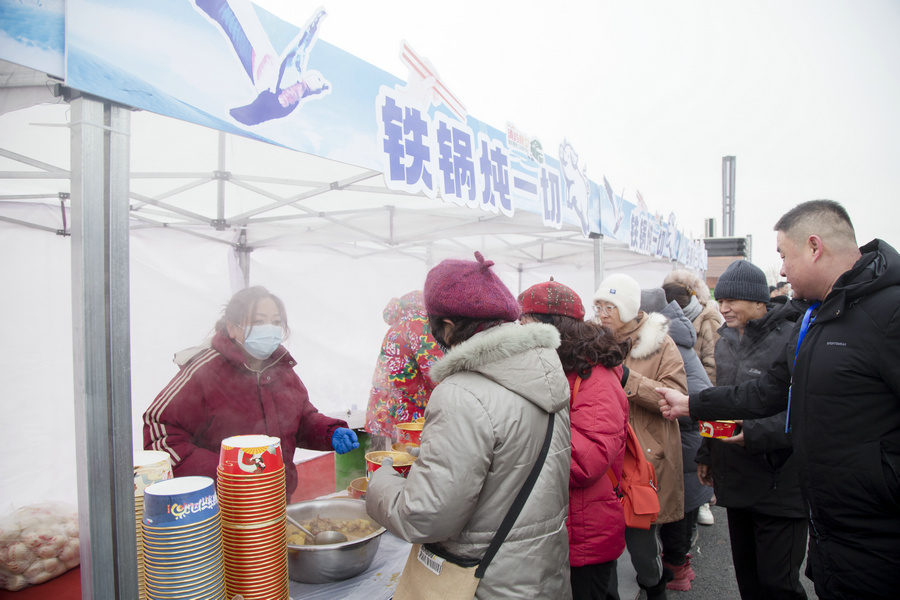 1月4日清晨,游客在房車營地內(nèi)排隊(duì)領(lǐng)取鐵鍋燴菜