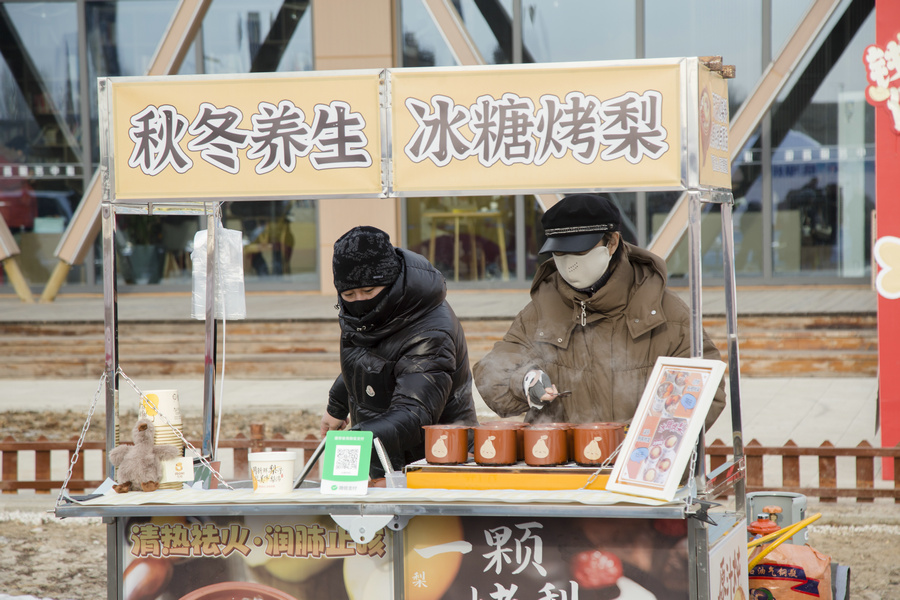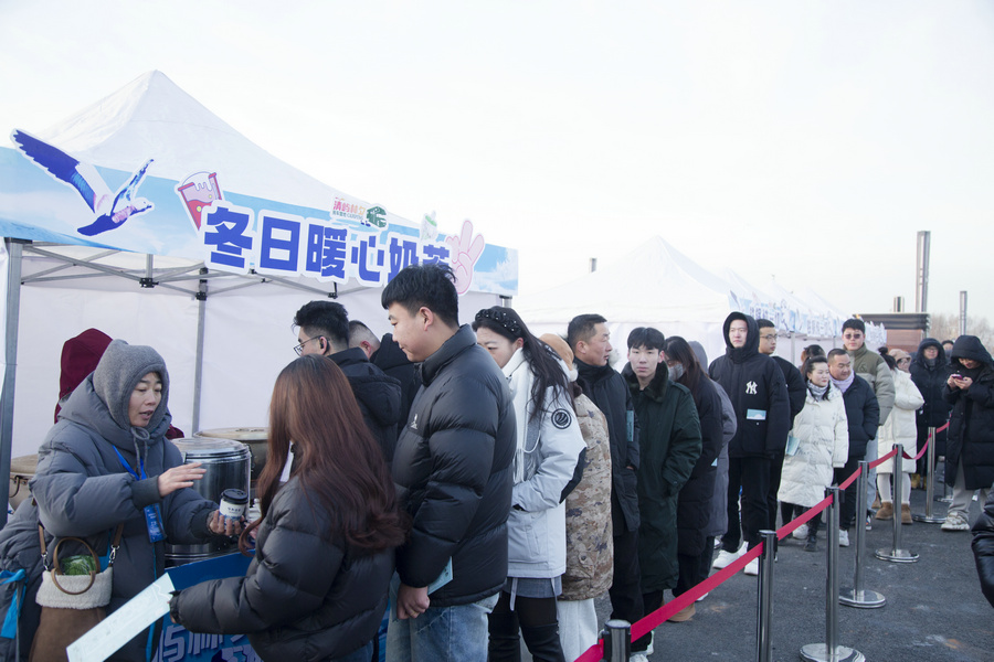 1月4日清晨,房車營地內(nèi)的暖冬造趣節(jié)現(xiàn)場游客在排隊(duì)領(lǐng)取免費(fèi)奶茶