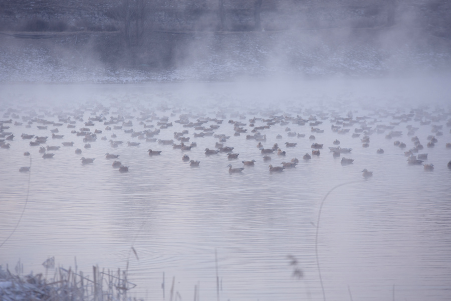 1月4日清晨,赤麻鴨在呼和浩特“千島湖”中游弋