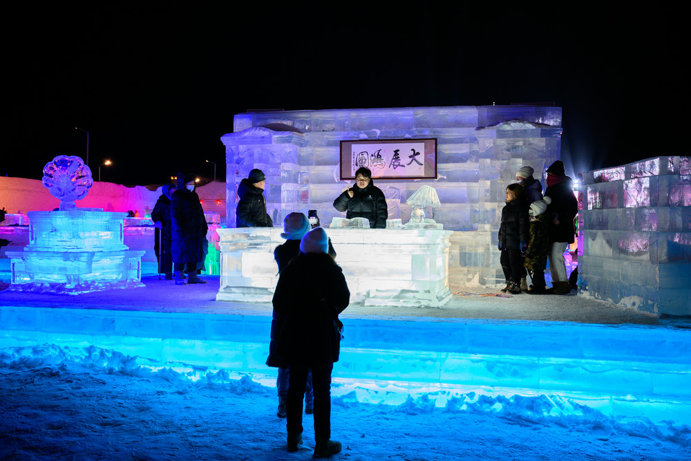 游客在《冰雪芳華》主題樂園內(nèi)拍照打卡