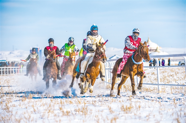 1月18日,錫林浩特市那達(dá)慕風(fēng)情園內(nèi)馬蹄踏雪、人聲鼎沸,“歌游內(nèi)蒙古·暢享錫林浩特”——冬季那達(dá)慕暨蒙古馬超級(jí)聯(lián)賽在歡騰的歌聲中拉開(kāi)序幕。開(kāi)幕式上,隨著馬蹄的噠噠聲,一支雄壯的馬隊(duì)踏雪而來(lái),騎手們身著艷麗的蒙古袍,駕馭著矯健的蒙古馬,以整齊的隊(duì)列自遠(yuǎn)處緩緩走來(lái)。歌聲悠揚(yáng),舞姿豪邁,演員們以動(dòng)人的演繹,完美詮釋了力量與藝術(shù)之美。本次賽事包含15公里耐力賽、10公里3人團(tuán)體接力賽、跑馬射箭、跑馬拾哈達(dá)、6公里走馬及搏克比賽等比賽項(xiàng)目。賽場(chǎng)上,騎手們馭馬飛馳,人與馬默契配合,在銀裝素裹的雪原上縱橫馳騁。在跑馬射箭與跑馬拾哈達(dá)項(xiàng)目上,騎手在飛奔的馬匹上挽弓搭箭、俯身拾物,動(dòng)作行云流水,精湛技藝引來(lái)觀眾陣陣驚呼與贊嘆。除了扣人心弦的比賽,本次活動(dòng)還為游客打造了豐富的冰雪互動(dòng)體驗(yàn)。冰雪涮肉宴香氣四溢,草原篝火電音派對(duì)將熱情推向高潮,千人雪戰(zhàn)、雪地拔河等趣味項(xiàng)目讓游客親身參與,盡情享受冰雪樂(lè)趣?,F(xiàn)場(chǎng)還同步舉辦了錫林浩特“伊德喜”草原冬儲(chǔ)肉展銷活動(dòng),讓游客在觀賽之余,還能選購(gòu)到正宗錫林郭勒牛羊肉,體驗(yàn)純正的草原風(fēng)味。(記者