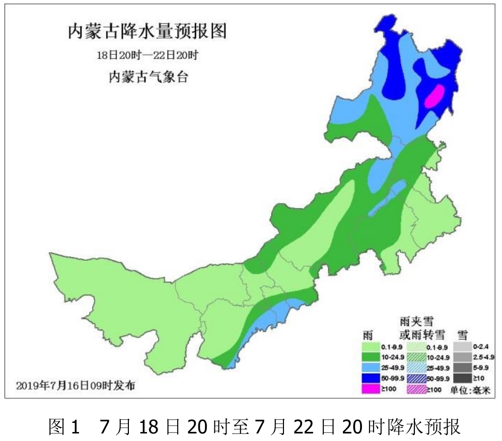 具體預(yù)報如下:7月18日20時至22日20時,全區(qū)大部有降水,累積降水量0.1~9.9毫米;鄂爾多斯市東部、包頭市東南部和北部、呼和浩特市中南部、烏蘭察布市南部、錫林郭勒盟東部、北部和南部、赤峰市西部和北部、通遼市北部、興安盟大部、呼倫貝爾市大部累積降水量10~24.9毫米;鄂爾多斯市東北部、呼和浩特市南部、烏蘭察布市西南部、錫林郭勒盟東北部、赤峰市北部部分地區(qū)、通遼市北部部分地區(qū)、興安盟西北部部分地區(qū)、呼倫貝爾市大部累積降水量 25~49.9毫米;呼倫貝爾市北部和東部部分地區(qū)累積降水量50~99.9毫米,呼倫貝爾市東部偏南部分地區(qū)累積降水量 100毫米以上(見圖 1)。