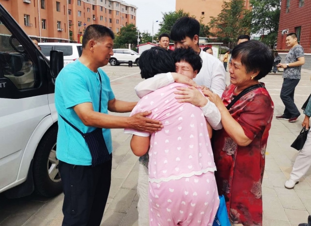 當(dāng)一行人下車后看到,迎接他們的李曉霞親人和包頭社會救助站的工作人員時都很激動,李曉霞與家人團(tuán)聚相擁而泣時,在場的每一個人都感動不已。