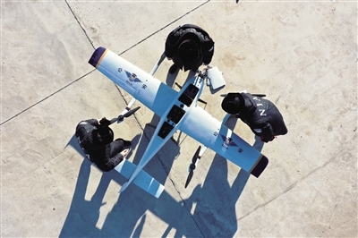 測量、加油、調(diào)試、升空……隨著螺旋槳高速轉(zhuǎn)動(dòng),一架 “鷹眼”固定翼無人機(jī)騰空而起,劃破北疆寂靜的天空,以每小時(shí)110公里的速度沿著邊管區(qū)巡航。