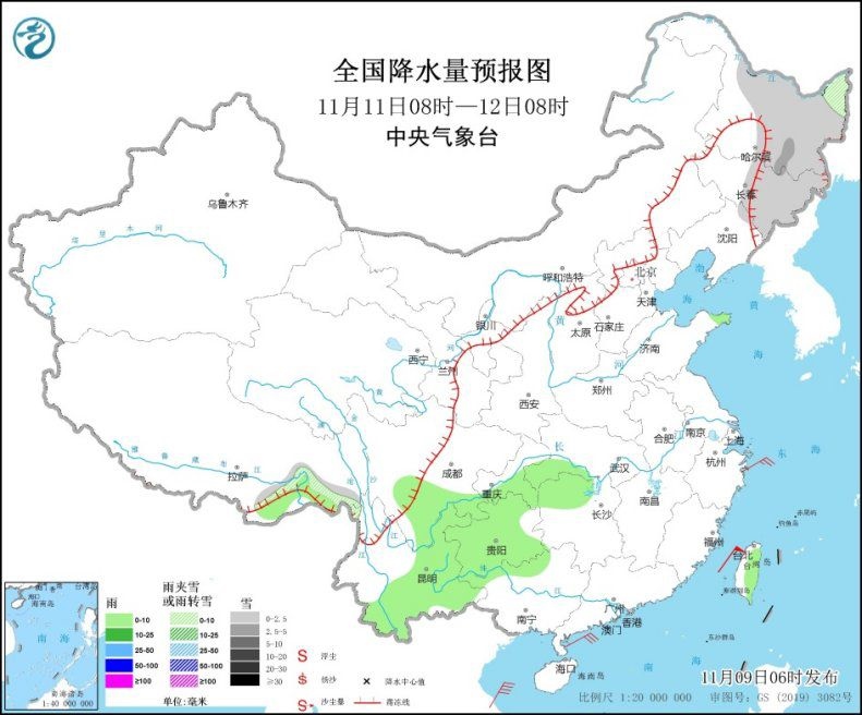 11月9日08時至10日08時,內蒙古東北部、東北地區(qū)大部等地部分地區(qū)有小到中雪,其中,黑龍江中西部、吉林中部、遼寧北部等地部分地區(qū)有大到暴雪(10~13毫米)。黑龍江東北部、川西高原北部、四川南部、貴州西南部、云南大部、臺灣島大部等地部分地區(qū)有小雨。內蒙古河套地區(qū)和中部、東北地區(qū)西部、黃淮東部、江南東北部等地部分地區(qū)有4~6級風,其中,西藏北部部分地區(qū)有6~7級風。