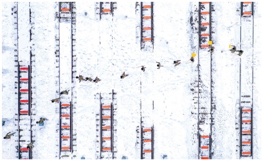 11月11日,在中鐵沈陽(yáng)局集團(tuán)有限公司通遼站南編組場(chǎng),武警官兵在清理積雪。新華社記者連振攝