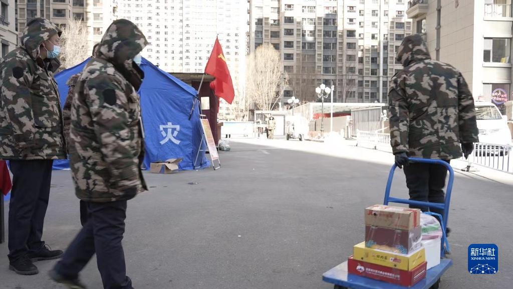 2月20日,呼和浩特市疫情防控工作人員為封控小區(qū)居民運送物資。新華社記者 達日罕 攝