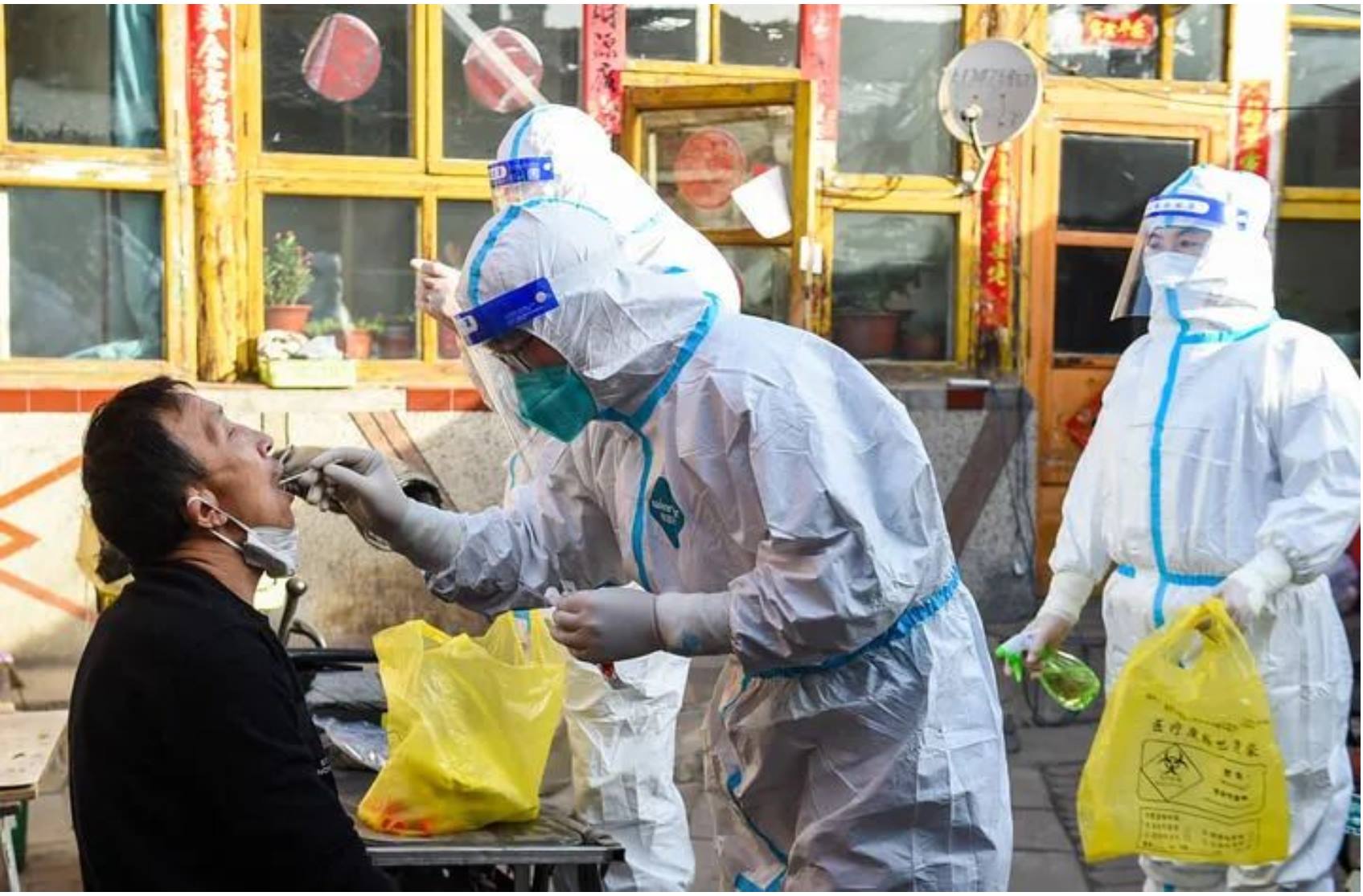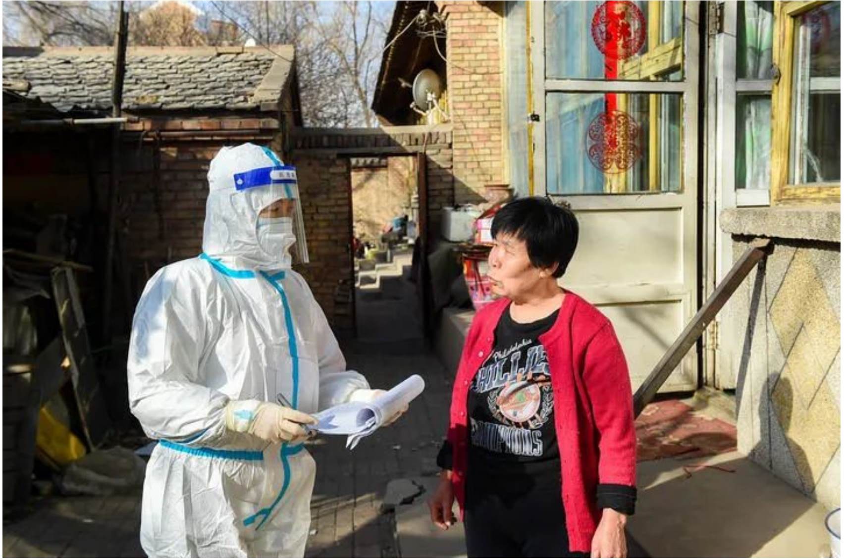 ↑3月6日,在呼和浩特市賽罕區(qū)東瓦窯社區(qū),網(wǎng)格員(右一)輔助醫(yī)務(wù)工作者為次密接群眾上門做核酸檢測(cè)。