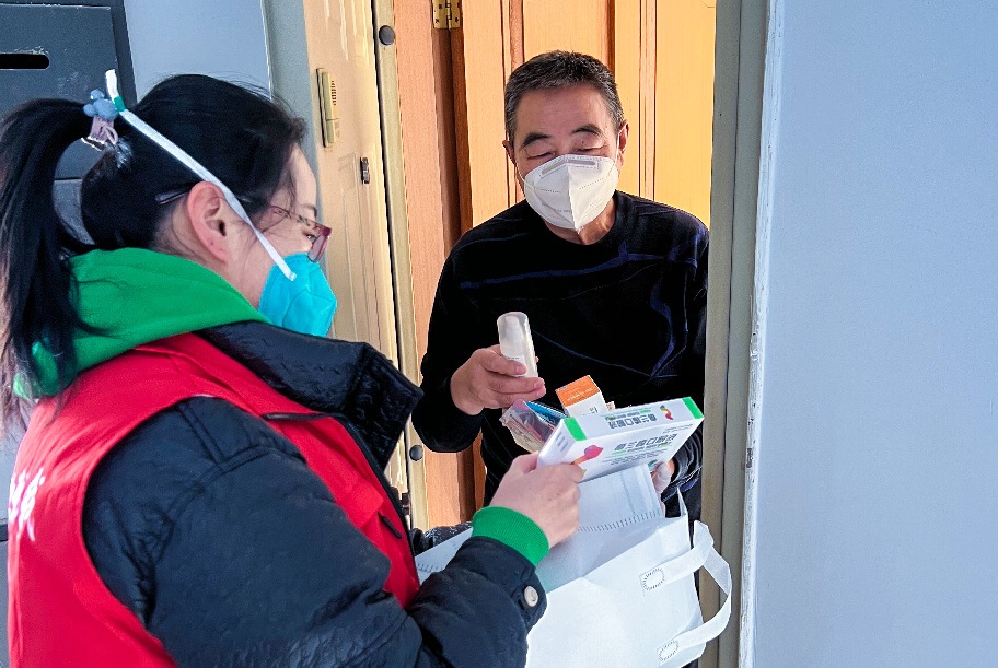12月26日,呼和浩特市玉泉區(qū)清泉街社區(qū)黨員志愿者上門為困難家庭老人發(fā)放“健康防疫包”。新華網發(fā)(丁根厚攝)