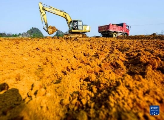2月16日,在湖南省永州市道縣壽雁鎮(zhèn)芽洞村,工人駕駛挖掘機(jī)在高標(biāo)準(zhǔn)農(nóng)田建設(shè)項(xiàng)目現(xiàn)場(chǎng)施工。