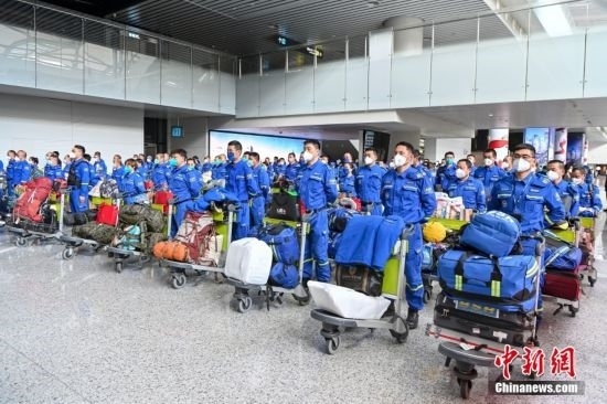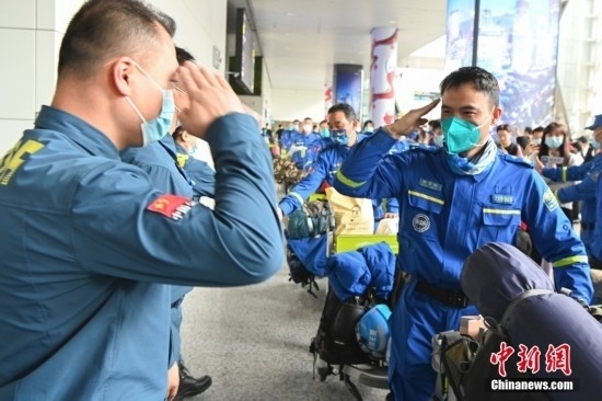 2月19日,廣東省廣州市,藍(lán)天救援隊(duì)赴土耳其隊(duì)員抵達(dá)廣州白云機(jī)場。當(dāng)日,100余名藍(lán)天救援隊(duì)赴土耳其隊(duì)員搭乘CZ8066航班返抵廣州。中新社記者 陳驥旻 攝