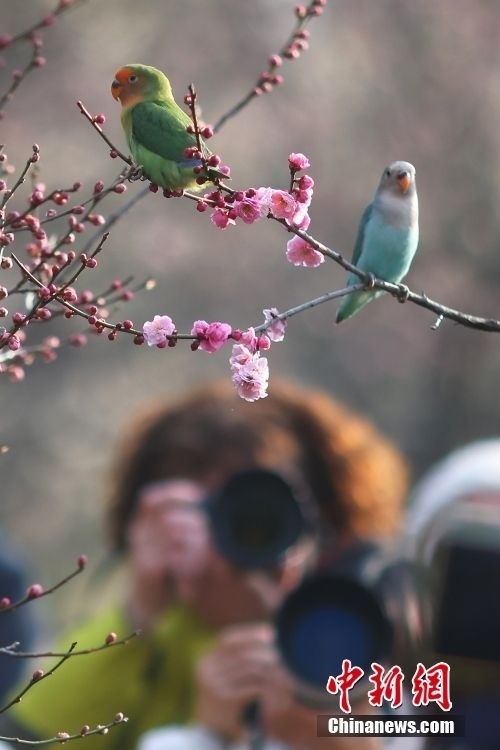 2月20日,江蘇南京,牡丹鸚鵡在梅花山梅花樹(shù)上“賞”梅。牡丹鸚鵡由南京一市民飼養(yǎng),每年在梅花盛開(kāi)的時(shí)候,他都會(huì)帶著鸚鵡來(lái)到這里“賞”梅,同時(shí)也成為一景。中新社記者 泱波 攝