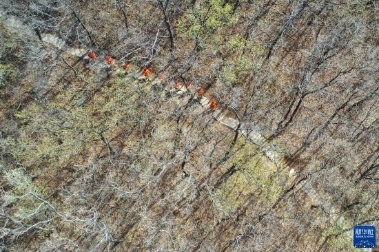 3月15日,長(zhǎng)清區(qū)國(guó)有蓮臺(tái)山林場(chǎng)防火中隊(duì)隊(duì)員在林區(qū)巡護(hù)(無(wú)人機(jī)照片)。