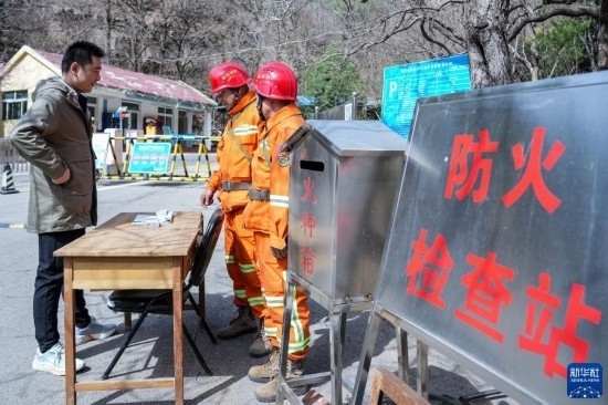 3月15日,長(zhǎng)清區(qū)國(guó)有蓮臺(tái)山林場(chǎng)防火中隊(duì)隊(duì)員在林區(qū)入口檢查火源。